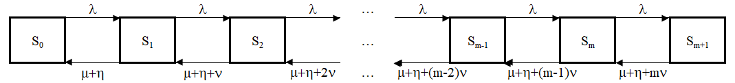 Sm+1 – в системе имеется (m+1)-заявок, 1-заявка обслуживается 1-каналом, m-заявок "нетерпеливо" ожидают в очереди;