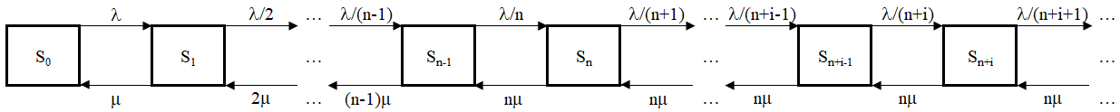 Sn+i+1 – в системе имеется (n+i+1)-заявок, n из них обслуживаются n-каналами n-заявок, а (i+1)-заявок ожидают в очереди;