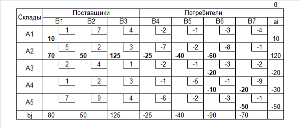bj – объём грузов (со знаком) j-ого конечного пункта (для поставщиков объём положительное число, для потребителей – отрицательное);