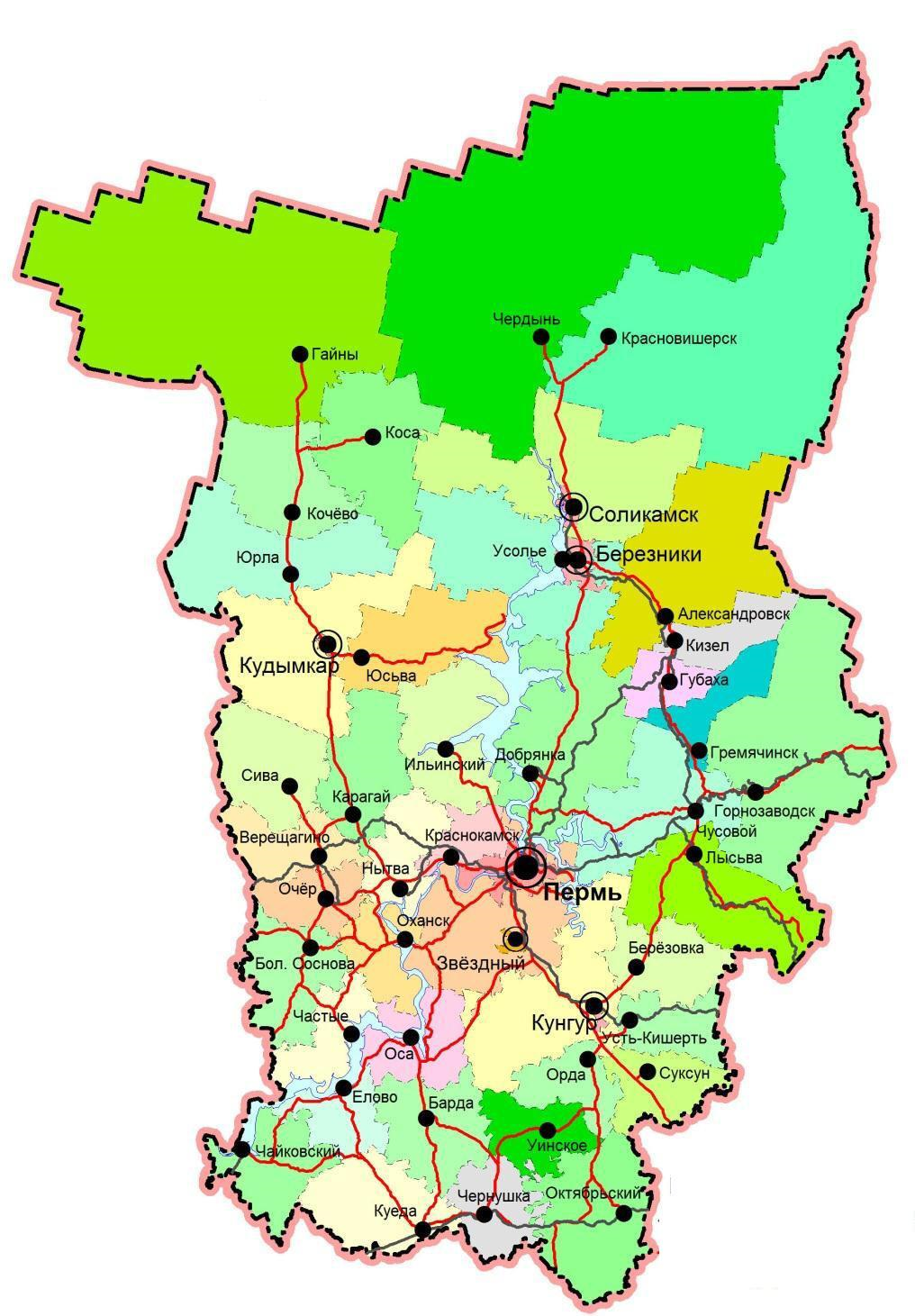 - 25 городов (Пермь, Александровск, Березники, Верещагино, Горнозаводск, Гремячинск, Губаха, Добрянка, Кизел, Красновишерск, Краснокамск, Кудымкар, Кунгур, Лысьва, Нытва, Оса, Оханск, Очёр, Соликамск, Усолье, Чайковский, Чердынь, Чермоз, Чернушка, Чусовой),