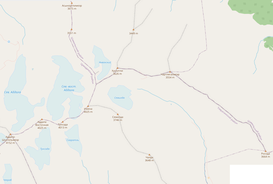 Несер (3548)(з), Пик Чкалова (3157)(з), Асынортлимеэр (3615)(с-з), Чартлягахмеэр (3554)(в), Росода (3664)(ю-в), Чалда (3648)(ю-в), Семилда (3746)(ю), Джилигит (3682)(ю-з), Беленги (4053)(ю-з), Косараку (4097)(ю-з), Тунсада (4013)(ю-з), Ижена (4025)(ю-з), Аддала Восточная (4025)(ю-з), Аддала-Шухгельмеэр (4151,7)(ю-з), Анчобала (4111)(ю-з).