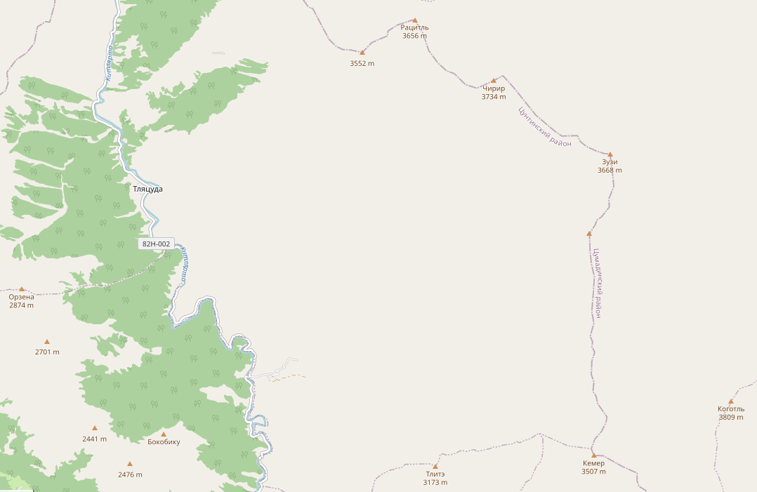 Итина (3478)(с-з), Гакку (3176)(с-з), Рацитль (3656)(с-з), Зузи (3667,8)(ю-в), Коготль (3809)(ю-в), Кемер (3507)(ю-в), Тлитэ (3173)(ю-з), Орзена (2874)(ю-з), Кириоти (3683)(ю-з), Букиатль (3469)(ю-з).