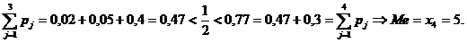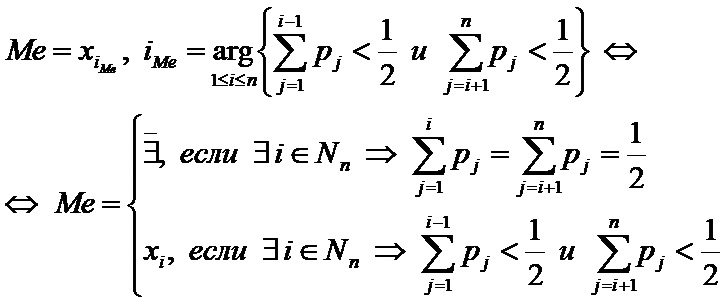 При отсутствии медианы у дискретной случайной величины, если в упорядоченном ряду её значений есть накопительные от начала суммы вероятностей равные 0,5, иногда применяют вспомогательную формулу: