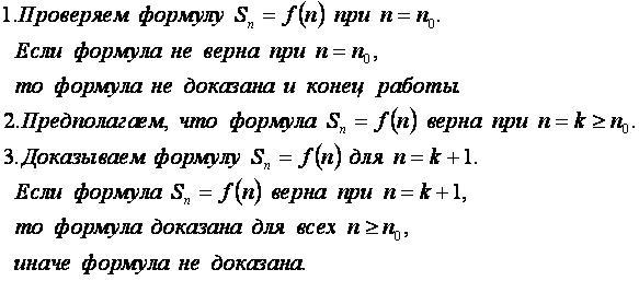 Метод математической индукции - это метод доказательства формул c целочисленной переменной, состоящий в проверке формулы при некотором начальном значении этой переменной, затем в предположении верности формулы при некотором значении переменной и в доказательстве верности формулы при следующем значении переменной. В этом случае метод математической индукции доказывает верность формулы при всех целочисленных значениях переменной, начиная с проверенного.