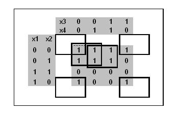 Минимальная дизъюнктивная нормальная форма для логической функции с числом аргументов до четырёх может быть построена с помощью карт Карно. Для этого единицы карты Карно последовательно покрываются прямоугольниками 4х2, 2х4, 2х2, 4х1, 1х4, 2х1, 1х2 и 1х1. Затем строятся элементарные конъюнкты МДНФ.
