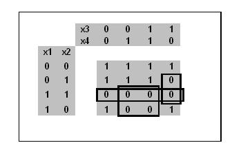 Нули карты Карно минимально покрываются одним квадратом вида 2х2, одним прямоугольником вида 1х4 и одним прямоугольником вида 2х1, что соответствует трём элементарным дизъюнкциям, в двух из которых два аргумента, а в одной три аргумента.