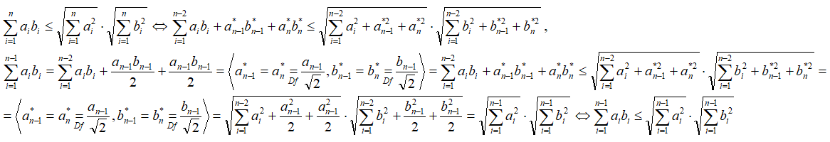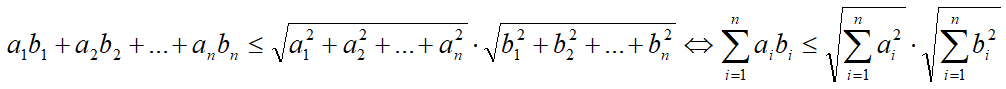Неравенство Коши-Буняковского – сумма попарных произведений n чисел с другими n числами не больше произведения корней из сумм квадратов этих чисел.
