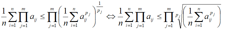 Обобщённое неравенство средних – средняя произведений i-ых положительных чисел из m наборов не больше произведения m корней pj-степени из pj-ичных средних.