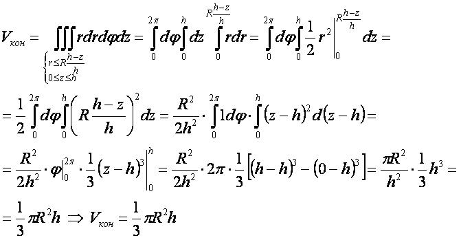 - Для вывода используется формула "объём трёхмерной фигуры" в цилиндрических координатах.