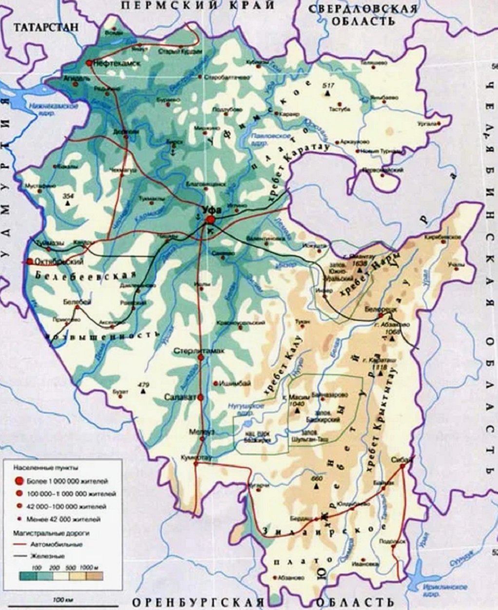 Высшая точка на территории республики — гора Ямантау (1640 метров). Площадь республики равна 142947 кв.км.