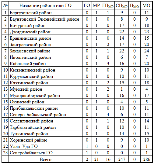 - 6 городов (Улан-Удэ, Бабушкин, Гусиноозёрск, Закаменск, Кяхта, Северобайкальск),