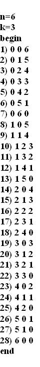 При n=6, k=3 получаем 28 распределений: