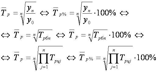 Средний темп роста — это положительное число, характеризующее средний рост показателя в относительных единицах. Рассчитывается как корень n-ой степени из отношения значений показателя (n-ого отчётного периода и базисного периода). При умножении на 100% измеряется в процентах.